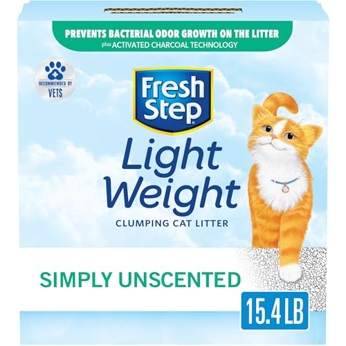 Fresh Step Lightweight Simply Unscented Cat Litter is free from added fragrances and dyes, with the same 10 day odor control power as scented regular Fresh Step cat litter. This lightweight formula is easy to lift, pour and store, and is 30% lighter with the same number of uses as a 22 lb box*. Formulated to prevent bacterial odor growth on the litter, this unscented clumping litter was made with your cats health and happiness in mind. The main active ingredients of clay, carbon and minerals work together to stop odors on contact, helping to keep cat litter box smells at bay and your house smelling fresh without added fragrance. Cleaning is fast and easy with clumping cat litter that quickly absorbs liquids and traps odors, forming tight clumps and leaving virtually no stinky crumbles. The 99.9% dust free formula helps keep surfaces clean around the home. *Fresh Step Simply Unscented
