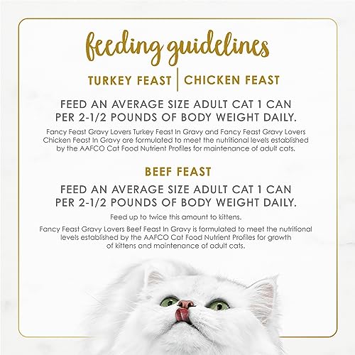 • An irresistible, protein-rich Fancy Feast Gravy Lovers cat food taste offering a gourmet turkey, chicken or beef cat food meal with an enticing aroma and a light, savory gravy