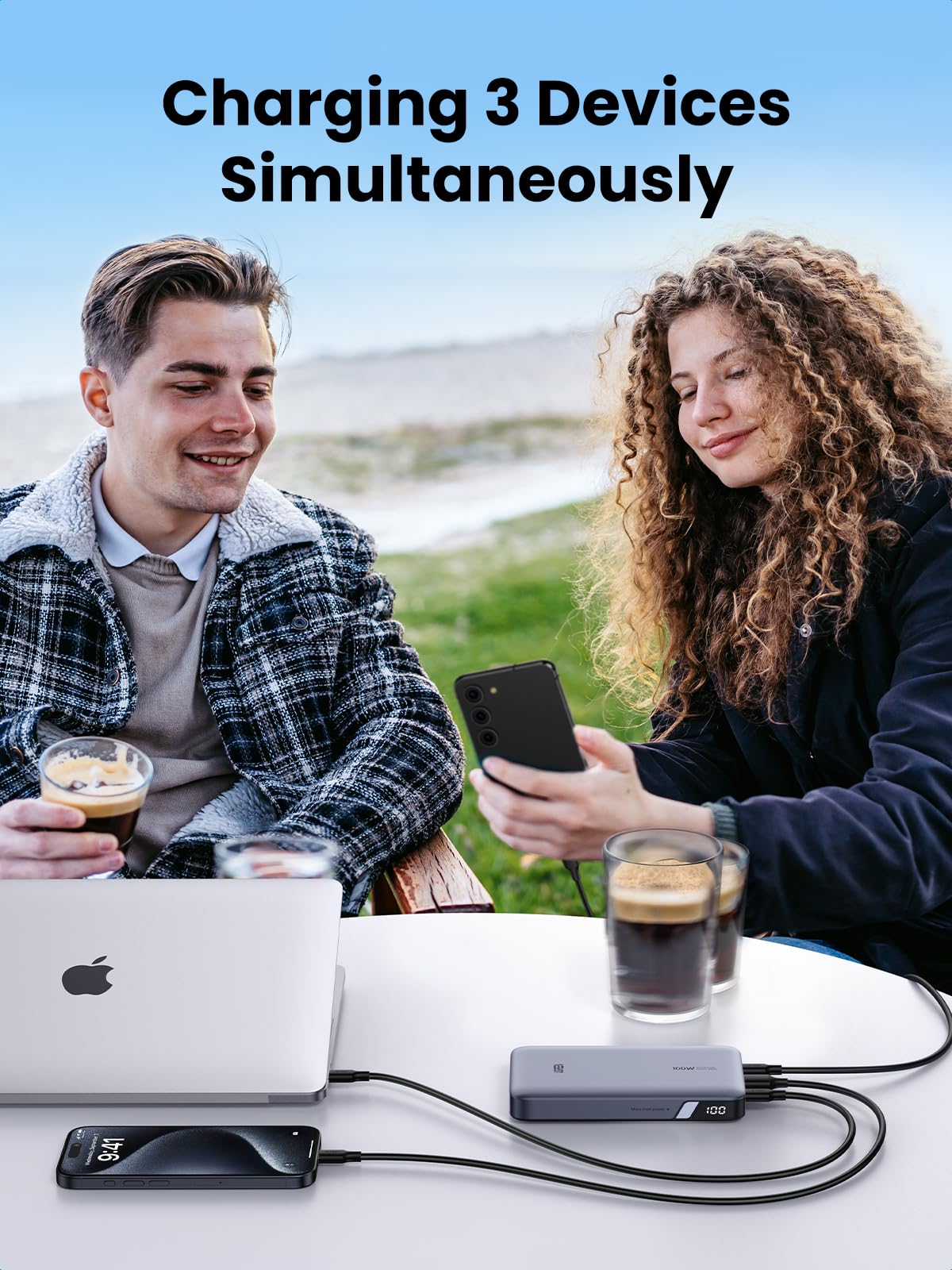 - 3-in-1 Fast Charging: Equipped with 2 USB C ports and one 22.5W USB A port, this powerful 100W power bank can charge 3 devices simultaneously, Macbook Pro 16″ can be charged to 42% in just 30 mins, and iPhone 15 can be charged to 55% in 30 mins