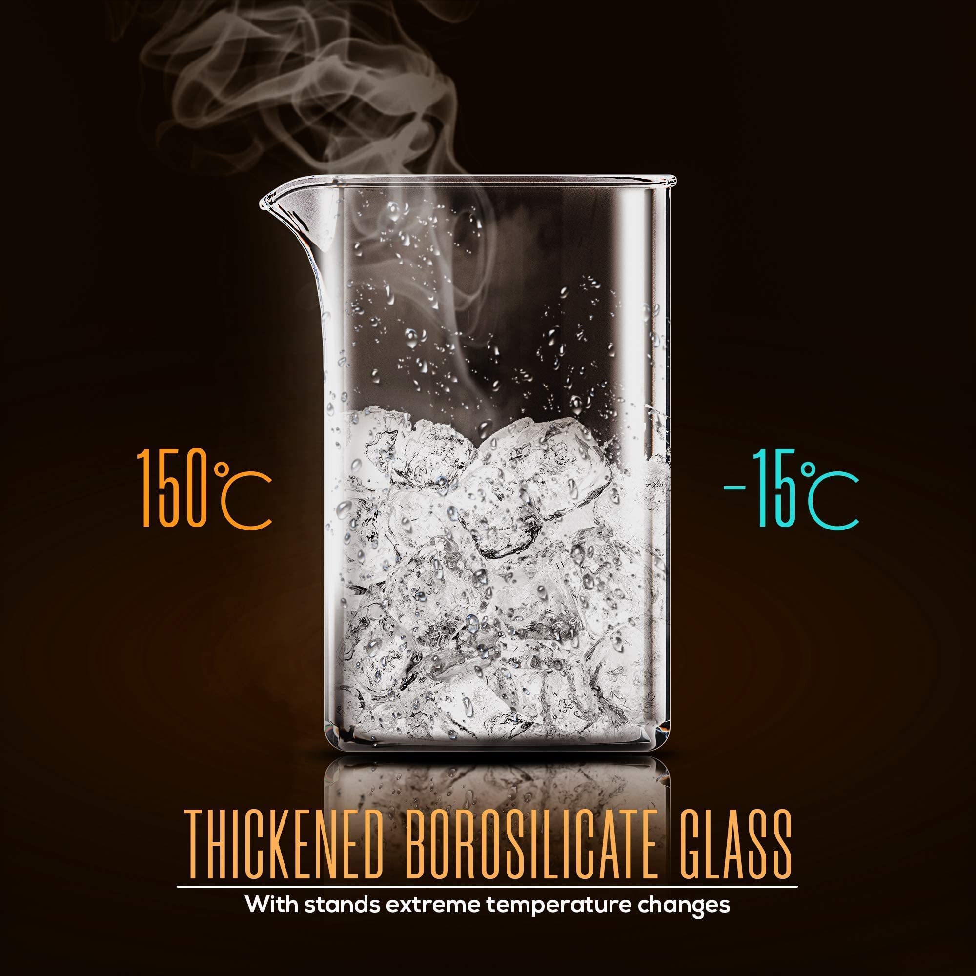 - DURABLE BOROSILICATE GLASS: The French press glass is expertly made to withstand rapid temperature changes. It is resistant to outside odors or chemical changes and maintains the original odor and flavor, allowing you to savor the natural coffee taste. The sturdy material and super-compact design ensure easy handling and durability in the long run.